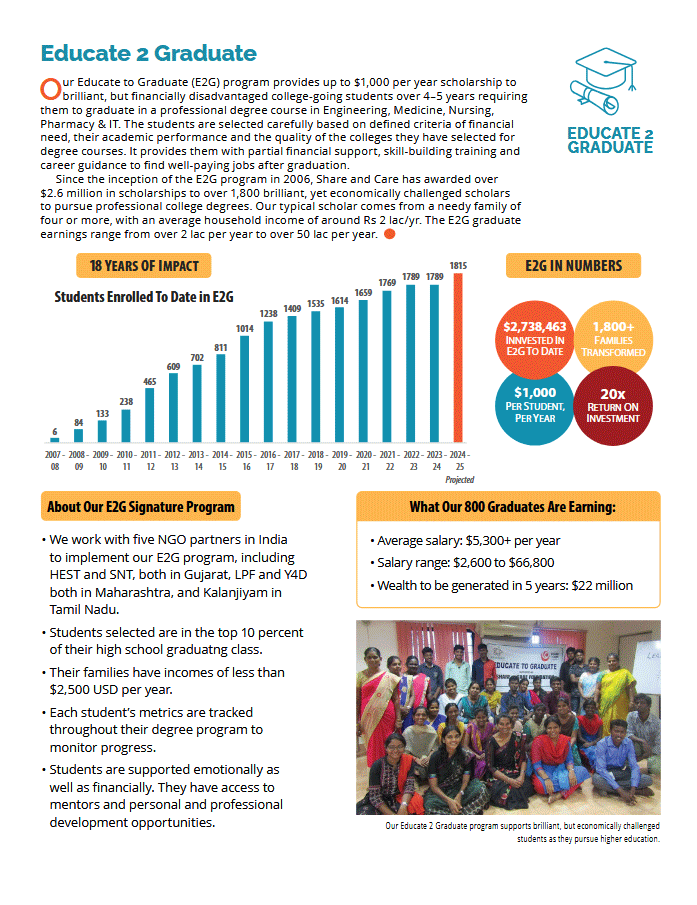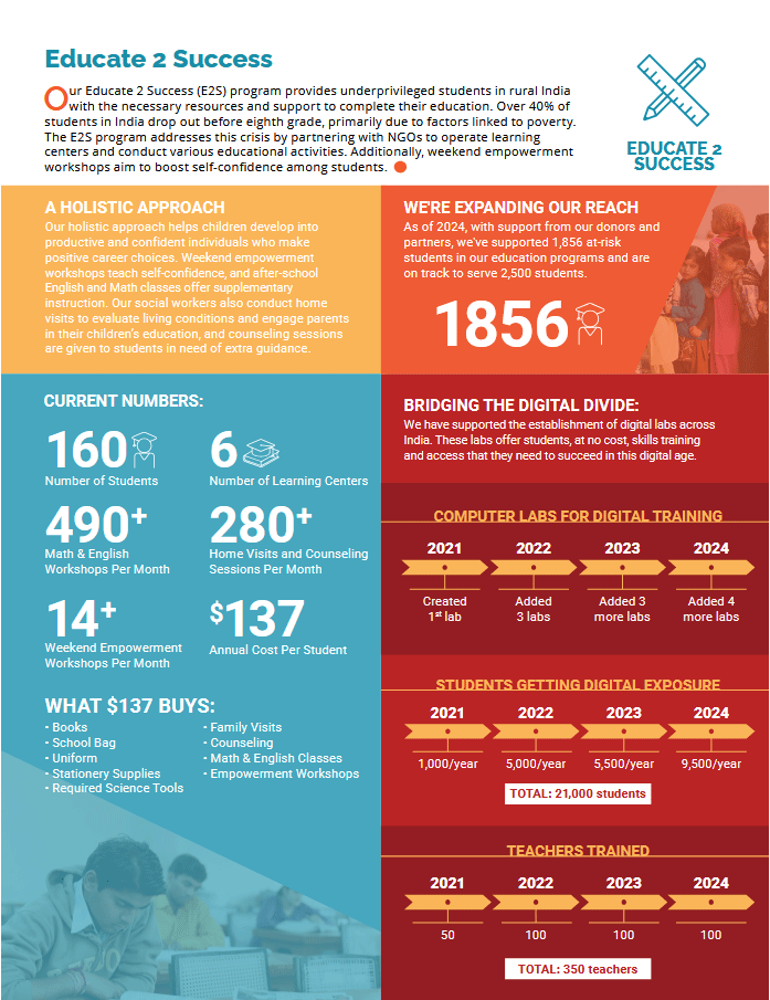 Each of our Signature Programs makes a lasting, sustainable change by partnering with NGOs on the ground in India to ensure we’re creating innovative solutions to local problems. With the steadfast support of donors like you, we have distributed more than $80 million in aid to create long-term, sustainable change for underserved populations in rural India. Explore the infographics from each to learn more about our impact.