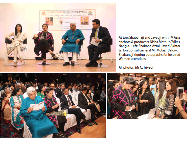 The Share and Care Foundation™, joined by TV Asia, presented an evening of speakers and dialogue to celebrate the launch of the initiative to “Inspire Change and Empower Women.” Major personalities from Bollywood joined media giants and public officials to celebrate the launch of the program. (Also see: TV Asia’s YouTube Video, An Evening with Javed Akhtar and Shabana Azmi, Parts 1 and 2, below.)